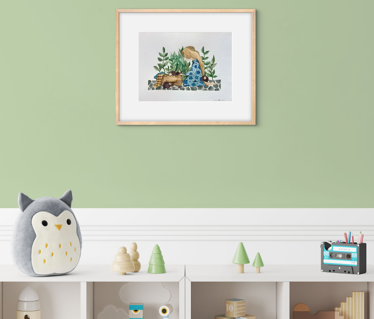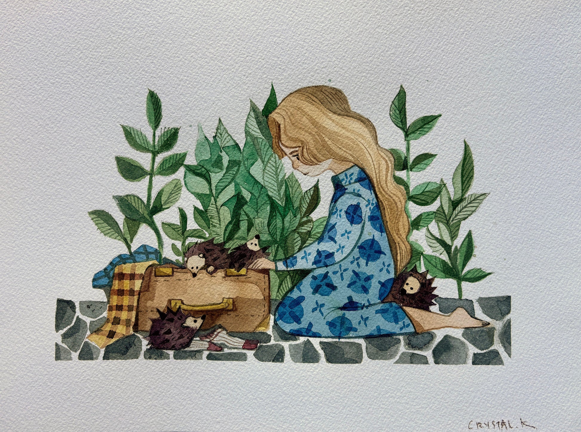 In this sweet storybook watercolor, a young girl is delighted by a suitcase full of hedgehogs.