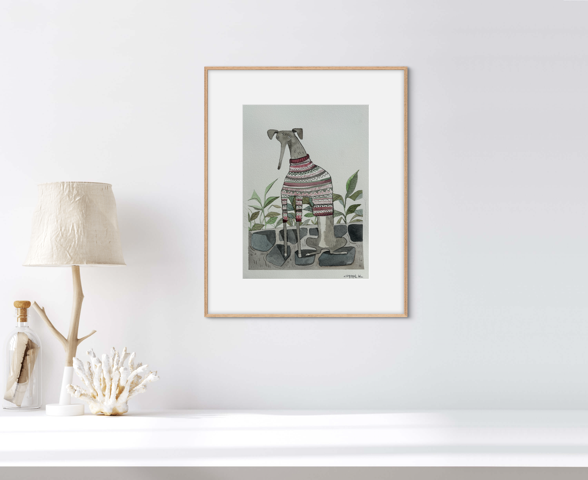 Inspired by her neighbor's greyhound and his sartorial choices, this wonderful piece also features Crystal's signature flora.