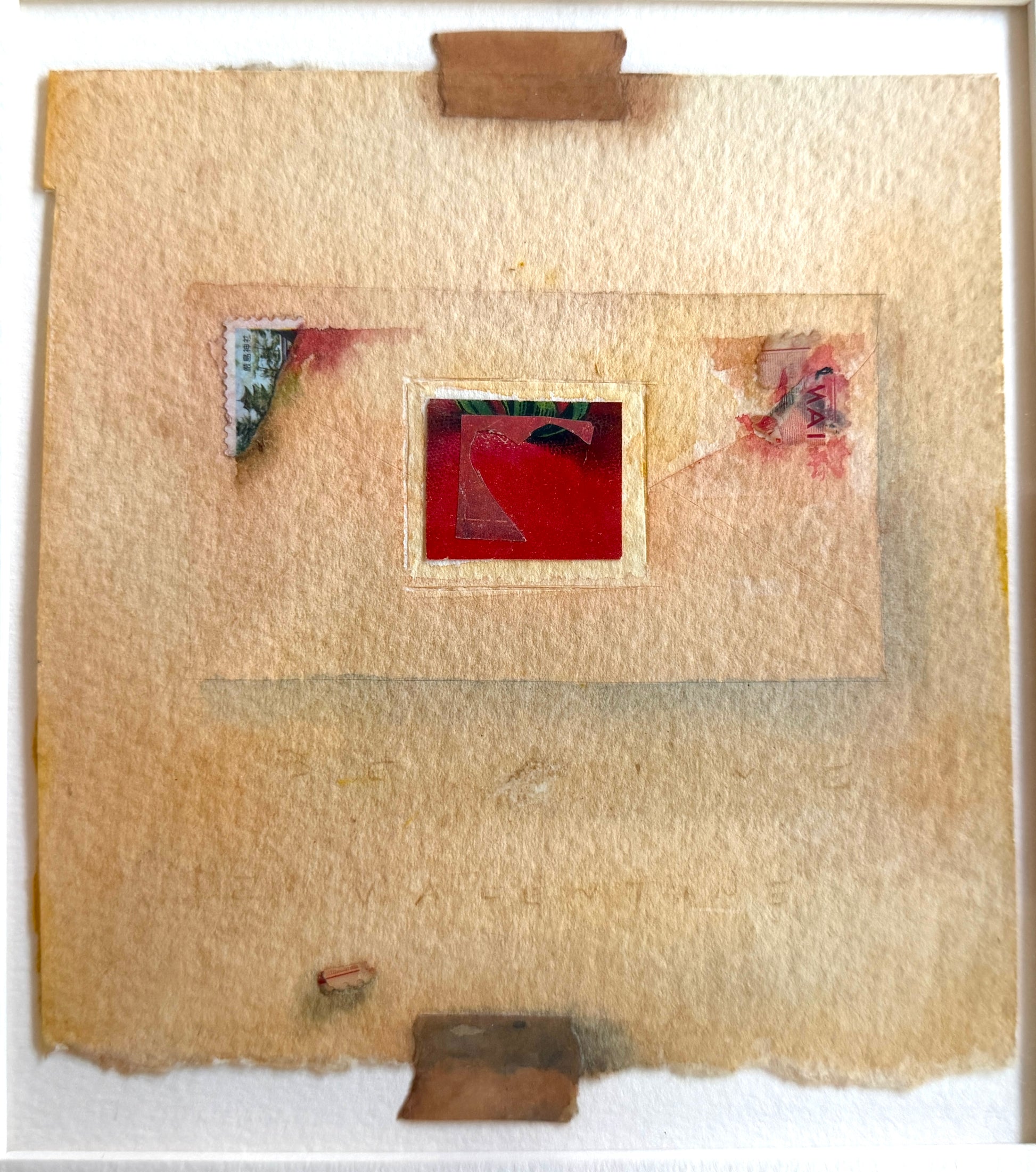 Dave has been producing these Valentine images for years. A combination of painting and collage, they are tender micro-worlds. This Valentine has a subtle tiny heart, and a Japanese stamp.