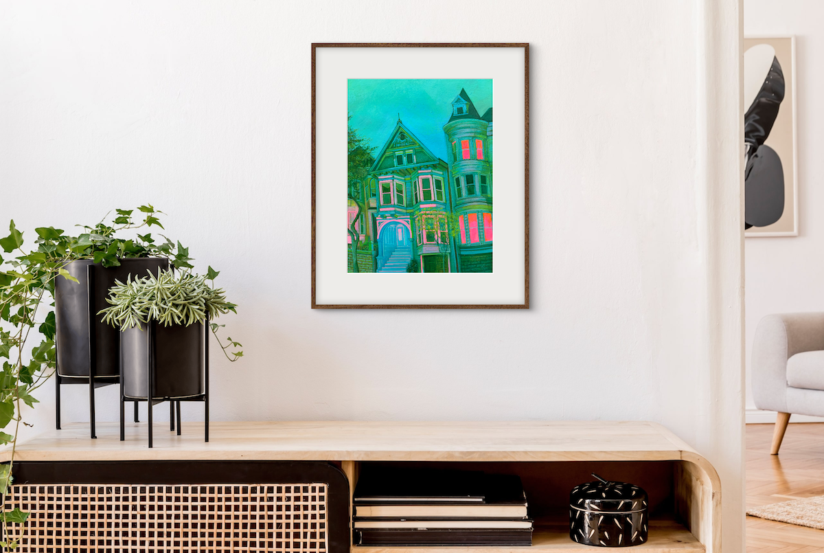 Ornate Victorians stand sentry in the early evening. This gorgeous gouache features Jenna's signature chromatic play - cold greens and blues vibrate against the wild interior pinks.
