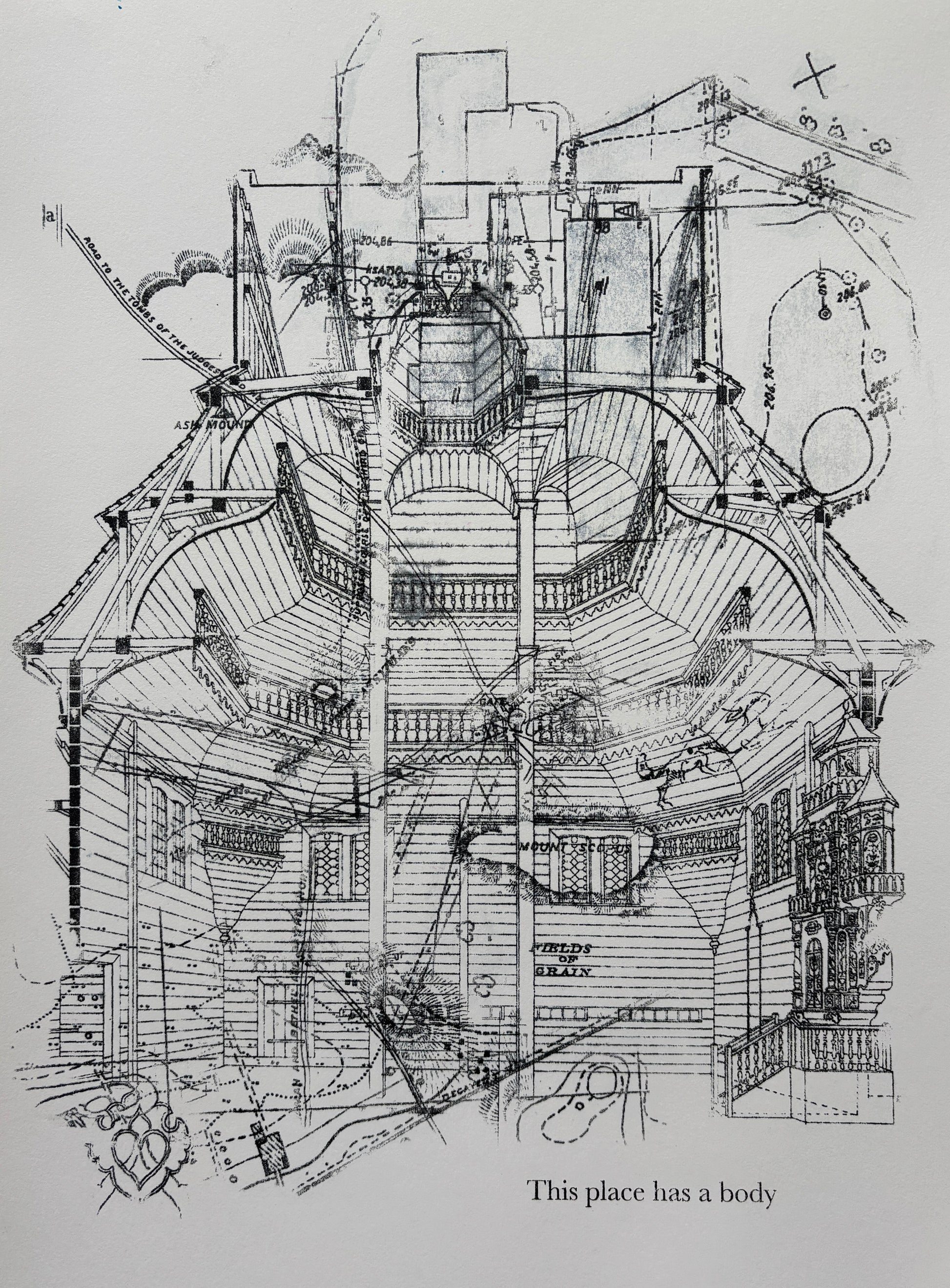 This Place Has a Body is part of the larger project Site: Yizkor. Composed of architectural renderings of vanished buildings, maps of disappeared places, and decorative details from the interiors of destroyed synagogues, Site: Yizkor activates remembrance through a layered cartography.