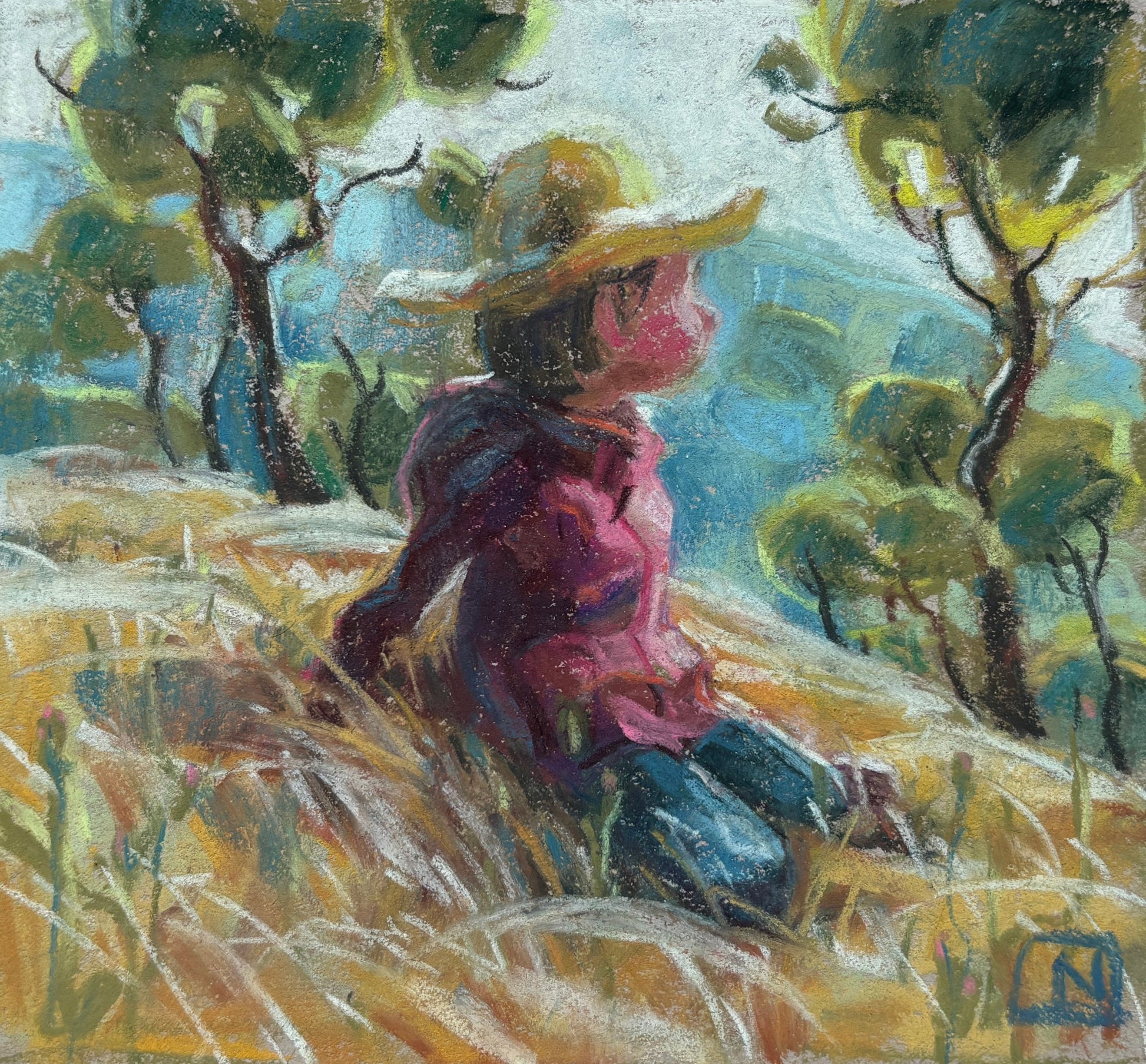 This series of plein air pastels were done over the course of many years (from roughly 2014 through to 2021) and feature Noah's growing children in the surrounding Northern California wilderness. Nupastels on sketchbook paper.