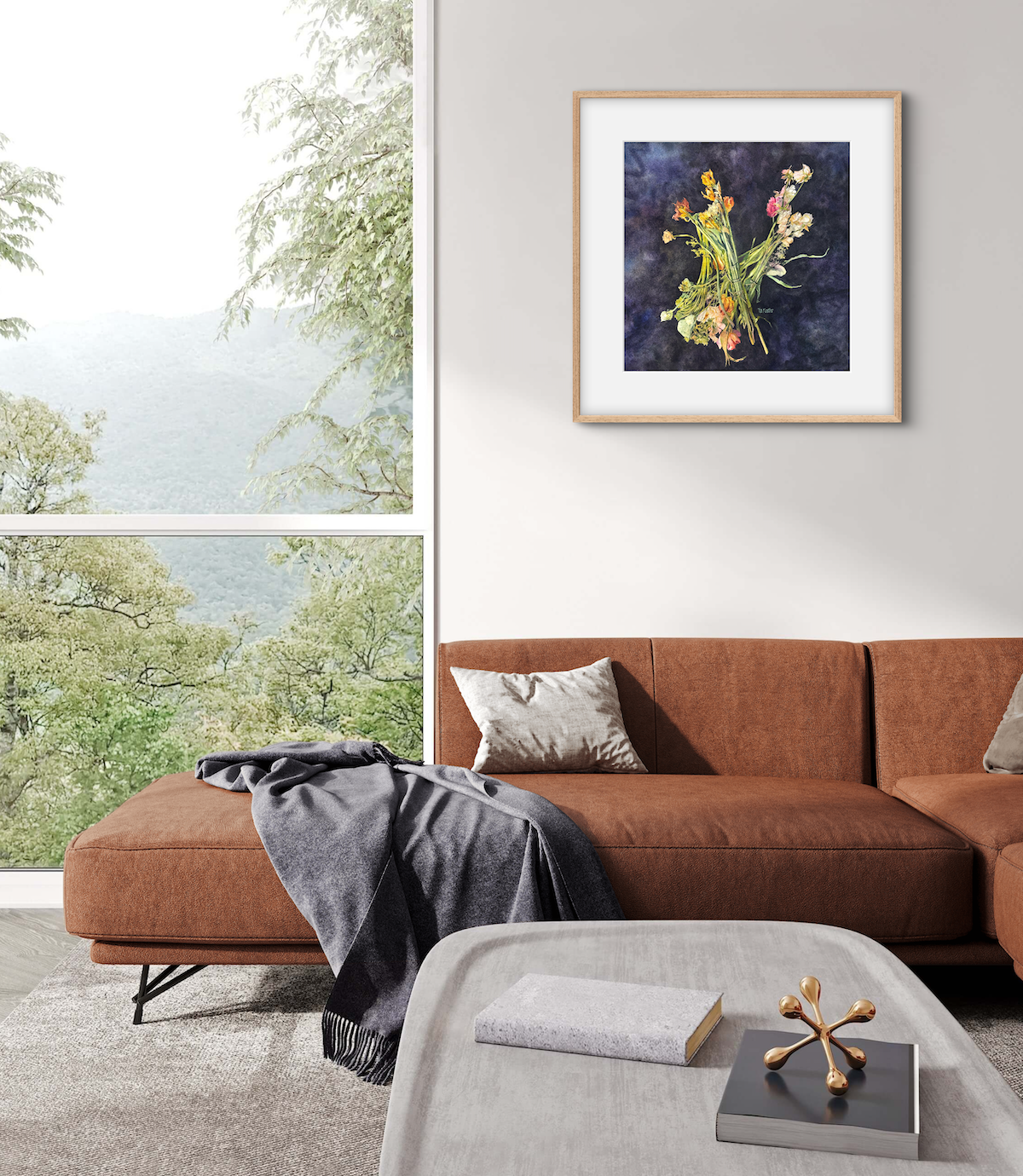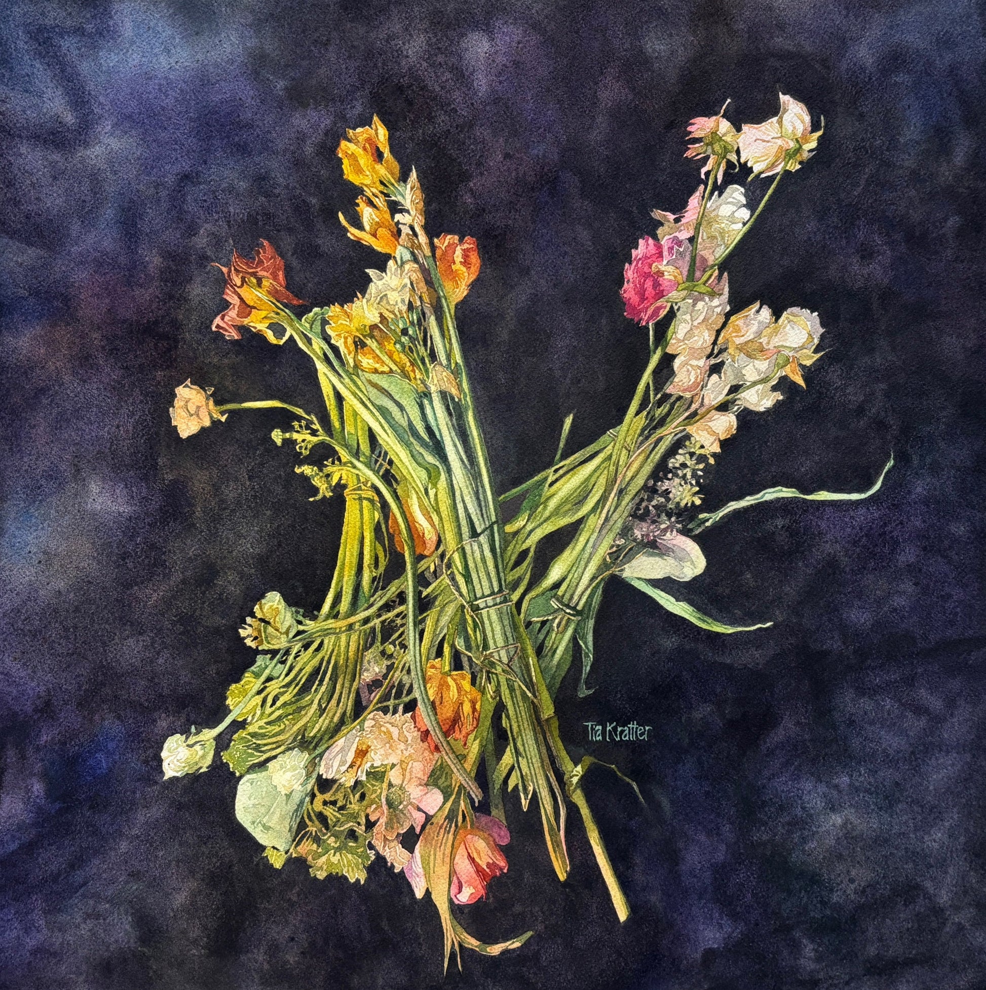 "A lot of my work, my 9 to 5 job, involved textures and colors. And I think somehow over the years that subconsciously has transferred it into these odd subjects that I happen to love painting. Very weird objects that I come back to a lot. Dead flowers because of that wrinkled texture..." -TK